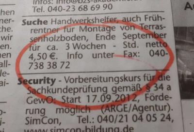 Drei Wochen lang sollten die "Helfer" Ende des Monats für S. Terrassenholzboden verlegen. Dass 4,50 Euro/Stunde selbst auf eine Vollzeitstelle hochgerechnet gerade einmal 770 Euro netto im Monat bedeuten, kümmert den Handwerksmeister kaum. Im Gespräch mit www.igbau-hamburg.de verweist er lediglich auf einen Bericht im Hamburger Abendblatt, der sich mit Dumpinglöhnen bei öffentlichen Unternehmen der Hansestadt beschäftigte. Ganz nach dem Motto: Was die dürfen, darf ich schon lange. Auf den Hinweis, dass der von ihm angebotene Stundenlohn nicht nur einfach niedrig, sondern sittenwidrig ist, erwiderte S. am Ende pampig: "Lässt sich ja nicht ändern".