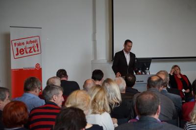 Schon vor Beginn der Veranstaltung wurde eifrig diskutiert - hier Hamburgs IG BAU-Vorsitzender Matthias Maurer mit Referentin Renate Wapenhensch.