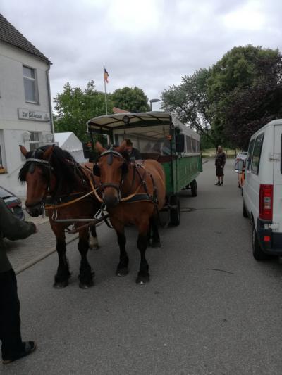 Nach einem reichlichen Frühstück starteten wir mit unserer Kutschfahrt durch die Lewitz. Die Lewitz ist eine unter Schutz gestellte Landschaft in Mecklenburg-Vorpommern, die durch weite und ebene Wiesen- und Ackerflächen, Fischteiche und vereinzelte Waldflächen geprägt ist. Dabei hatten wir mit Gabriele Raasch eine sachkundige Begleiterin, die uns in geschichtlichen Fragen genauso sachkundig informierte, wie in Fragen zur Fauna und Flora der Region.