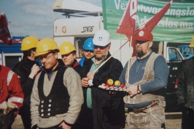 Der heutige Bezirksvorsitzende Matthias Maurer (vorne links, gelber Helm) beim Baustreik 2002 (Foto: privat).