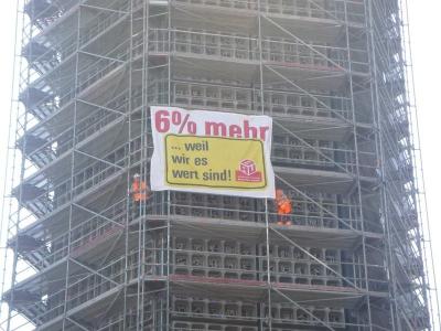 Unter dem Motto "Löhne rauf, sonst Helme runter!" zogen sie vom Bahnhof Zoo aus zum Ort der Schlichtungsverhandlungen und unterstrichen dort noch einmal die Tarifforderungen der IG BAU: 6 Prozent mehr Lohn, ein volles 13. Monatseinkommen und die Klarstellung: Wegezeit ist Arbeitszeit! Begleitet wurde die Demonstration vor Ort von mehreren Aktionen: So enterten Teilnehmer ein Gerüst an der Gedächniskirche und befestigten in luftiger Höhe ein Transparent - Aufschrift: "6 Prozent - weil wir es Wert sind!".