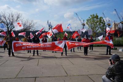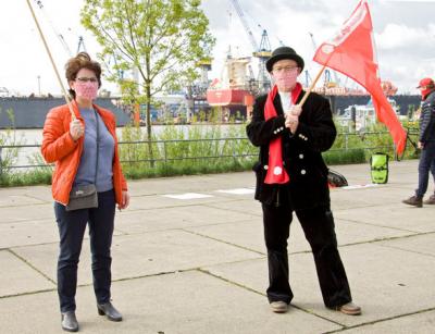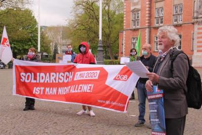 Ein bisschen was war außerdem trotzdem los in Hamburg. So versammelten sich die Gewerkschaftsspitzen symbolisch auf dem Fischmarkt. Mit 1. Mai-Banner, Fahnen und Plakaten machten sie das Motto des diesjährigen 1. Mai deutlich: "Solidarisch ist man nicht alleine." Auch in Bergedorf zeigten unsere Mitglieder Flagge. In Harburg engagierten sich die Kolleg/-innen im Bündnis gegen den geplanten Naziaufmarsch, der zum Glück verboten blieb. Dennoch gab es eine kleine Kundgebung vor dem Rathaus.