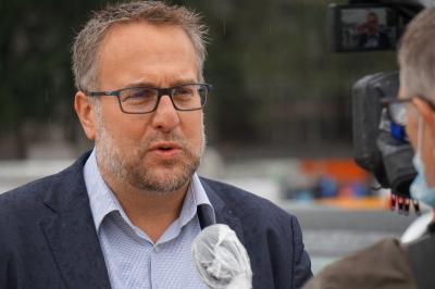 und IG BAU-Verhandlungsführer Carsten Burckhardt den anwesenden Medienvertreter- Innen zunächst den Hintergrund der Kundgebung ...